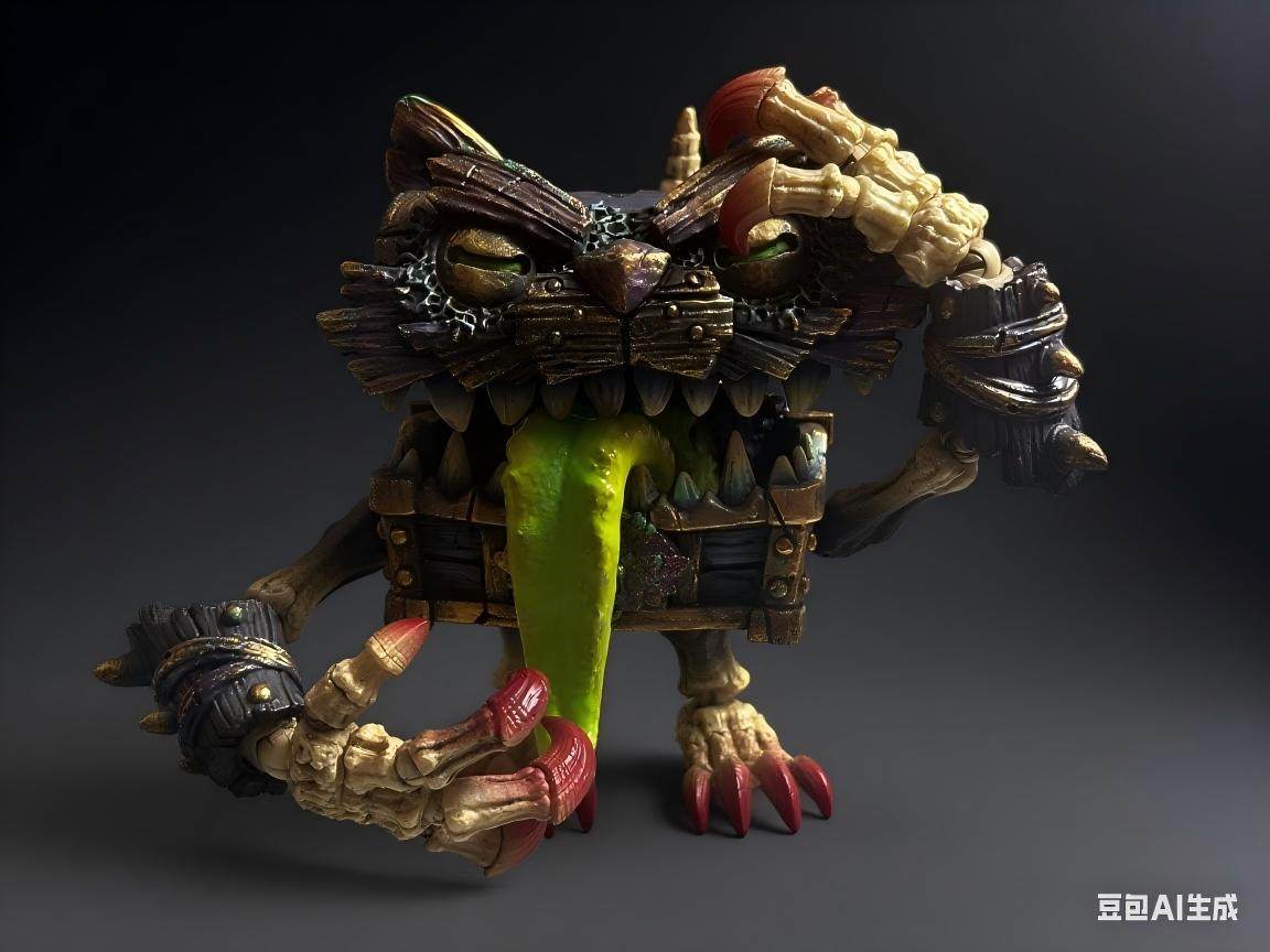 -箱體表面擁有仿舊木紋與生鏽金屬鉚釘的擬真質感,頂部貓耳造形與憤怒的貓眼生動傳神。
