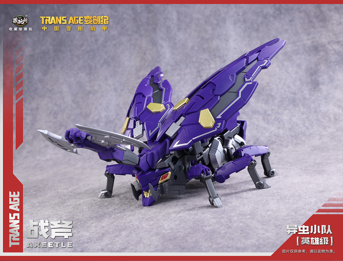 -人形高約18CM。戰斧的設計靈感源自威武的獨角仙。機甲上充滿了獨角仙的標誌性特徵,線條粗獷厚重,展現出異蟲小隊中堅力量的強大防禦與力量感。