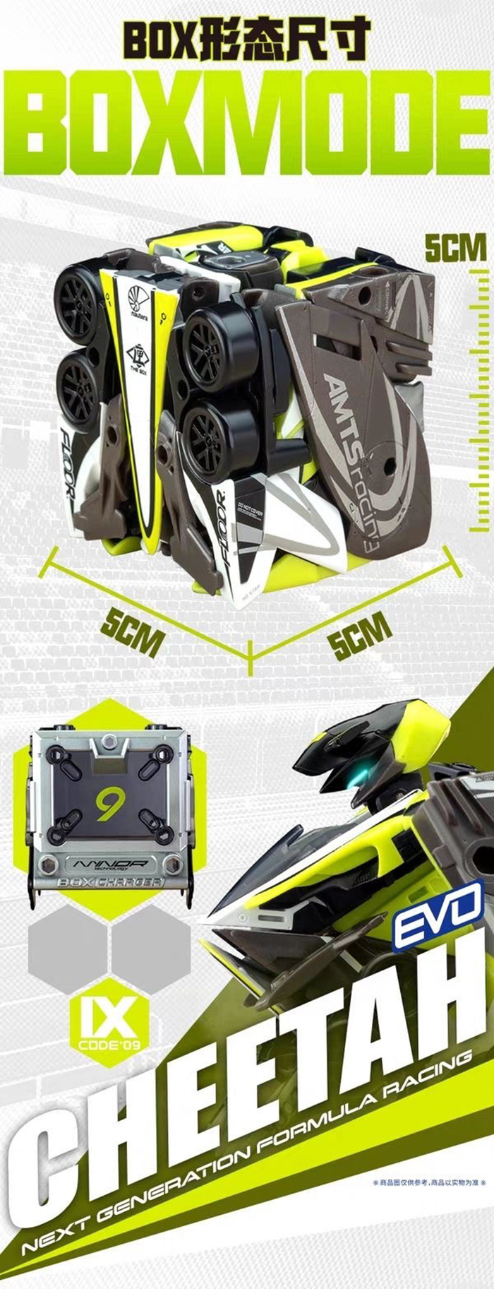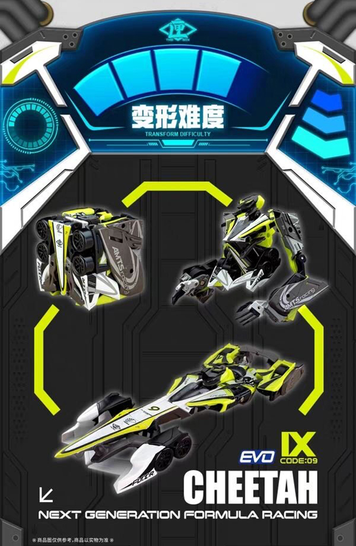 獵豹號 :醒目的白、亮綠賽車配色,造形修長,變形為方塊時呈現「數字 9」。