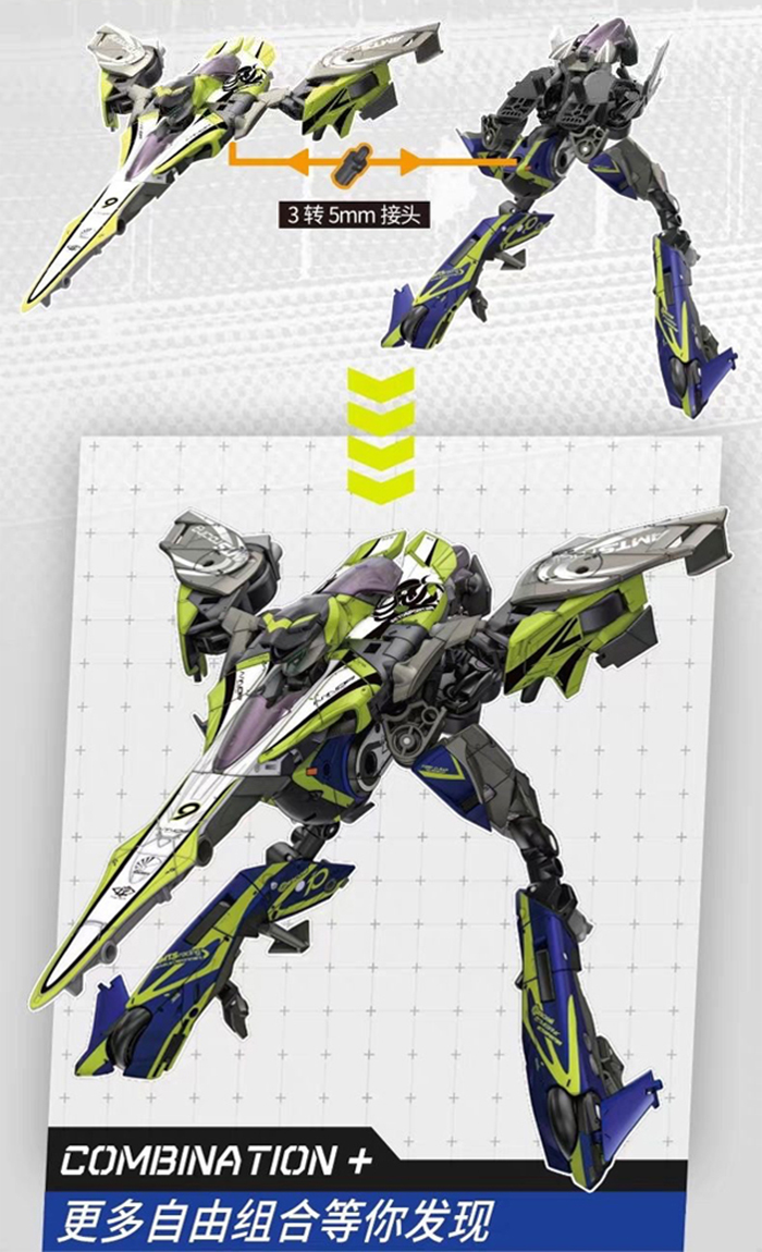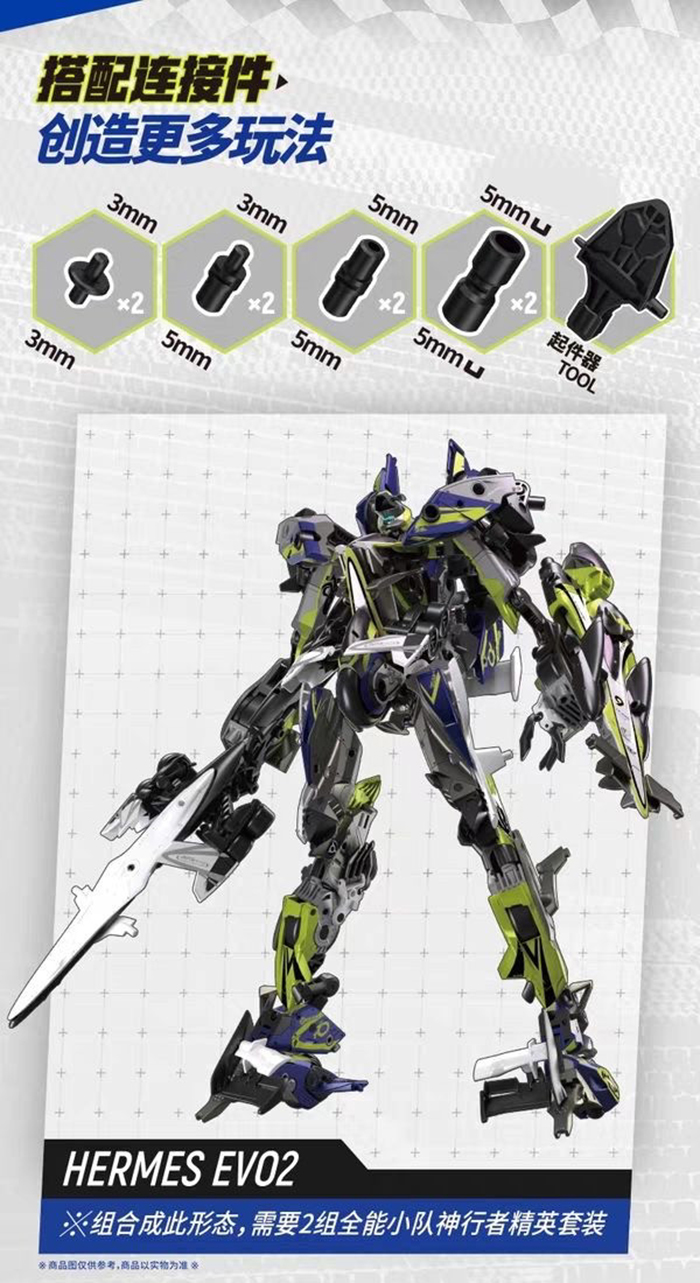 -套裝內附多種不同規格的轉接頭(3轉5、5轉5u等),可自由與全能小隊全系列商品(包括與其他機體進行更複雜的合體,如:組成上、下半身皆不同的型態)或猛獸匣系列聯動,創造出屬於自己的專屬機甲!