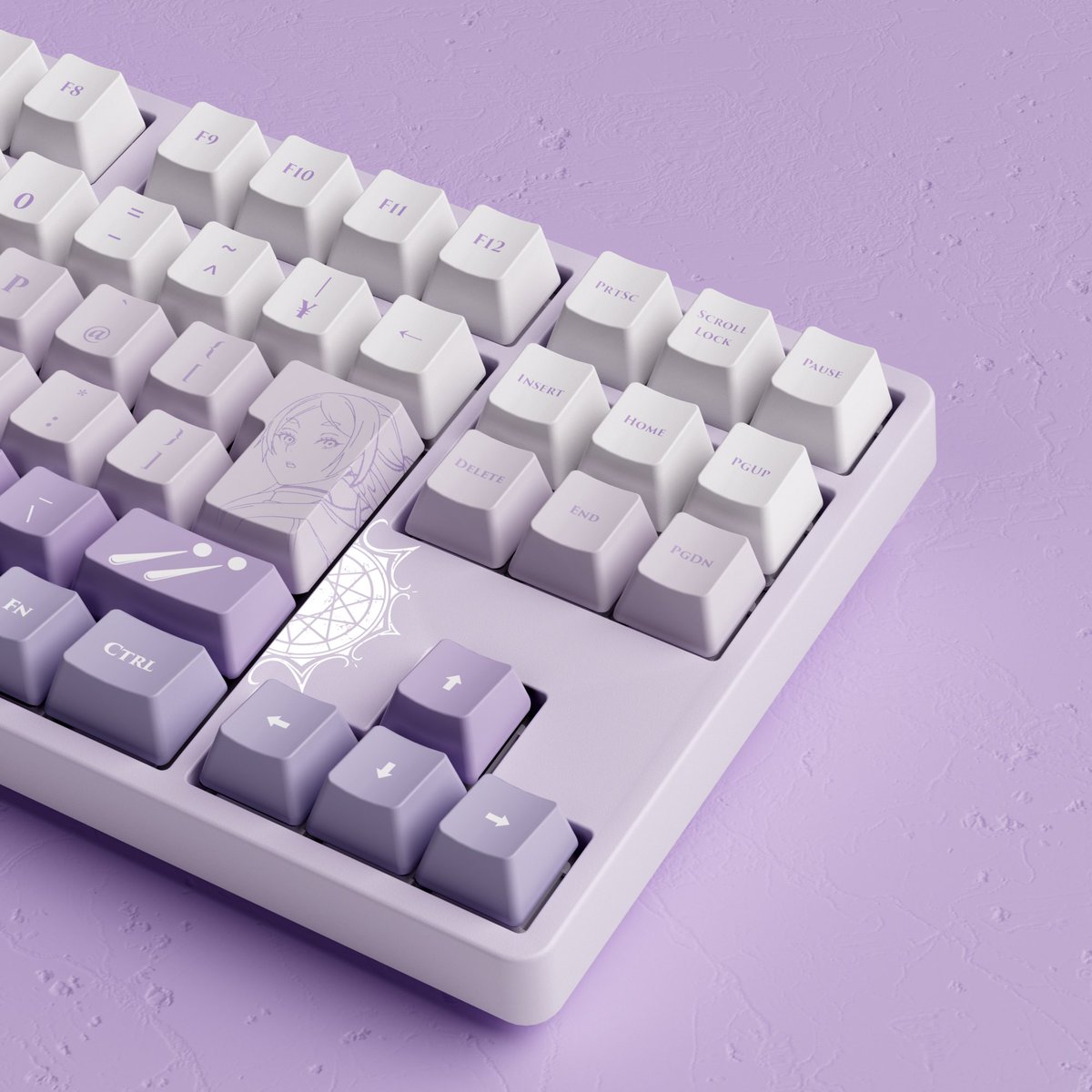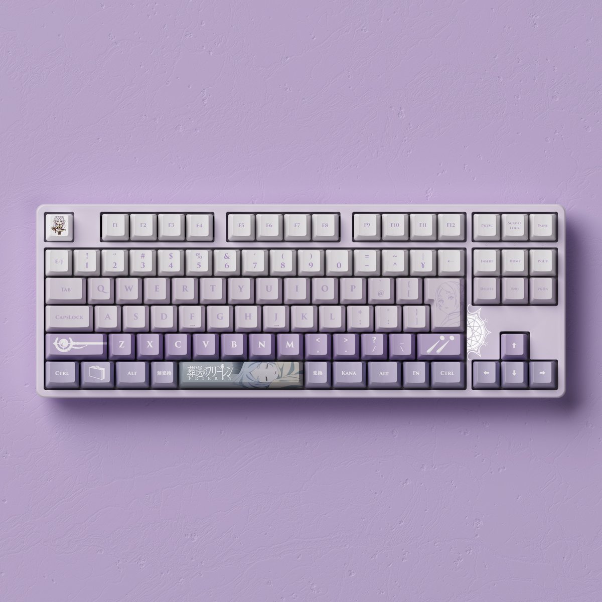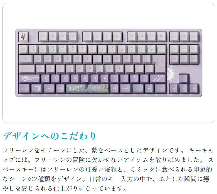 -外觀採用紫色系打造,並採用PBT熱昇華印刷鍵帽,手感細膩,敲擊聲清脆悅耳。處處可見芙莉蓮相關的元素,魔法陣、耳飾、魔法杖與行李箱都潛藏在其中。