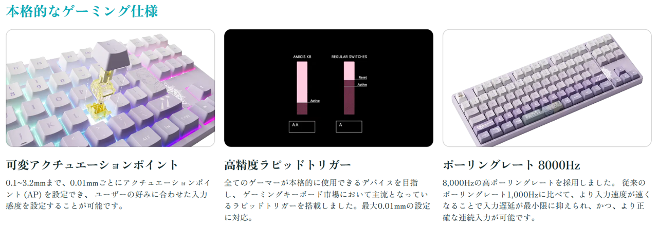 -搭載「Rapid Trigger」技術,觸發鍵程可調整0.01~2.0mm,以及8000Hz輪詢率,擁有極佳的反應速度,適合高強度遊戲需求。且內建磁力開關與反射感應器,帶來穩定流暢的輸入體驗。