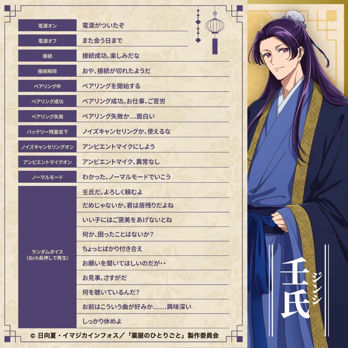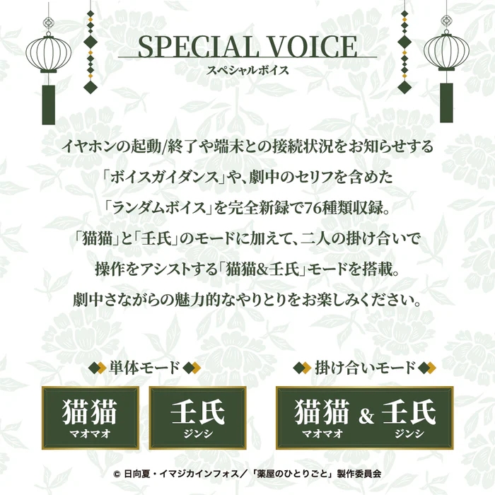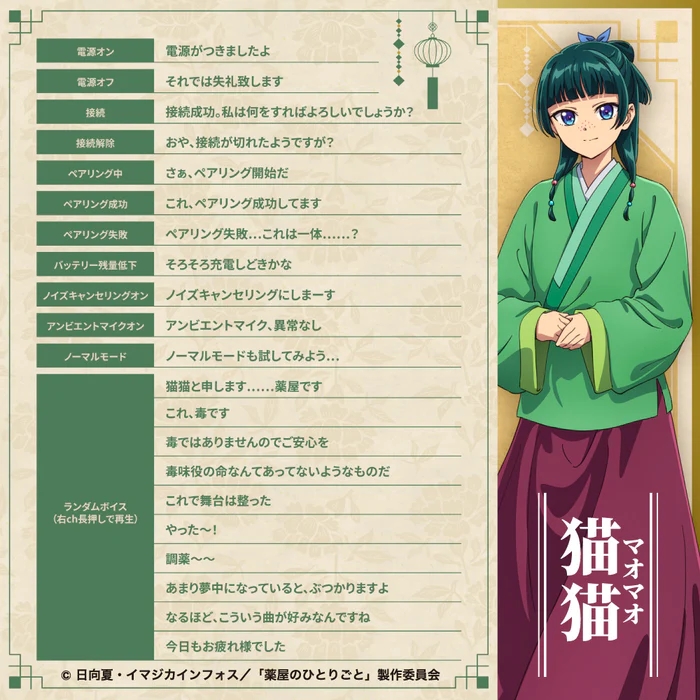 -內建多達76種全新錄製語音,由貓貓(CV:悠木碧)與壬氏(CV:大塚剛央)雙聲優傾情演出,不僅收錄經典台詞,更包括開機、連線、關機等語音提示。可以自由切換「貓貓模式」、「壬氏模式」或是聽他們互相鬥嘴的「雙人互動模式」,隨時隨地都能感受到角色的陪伴!