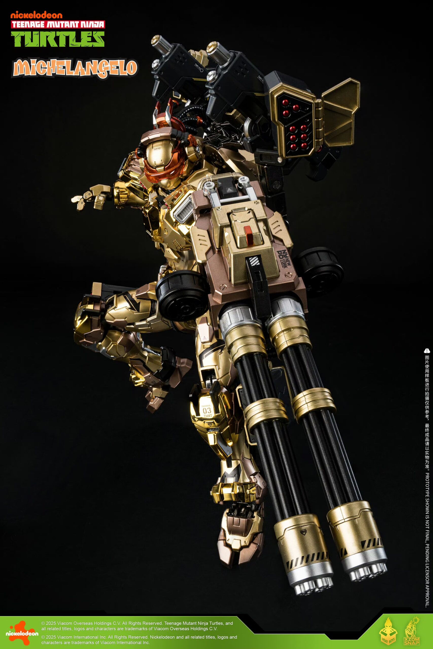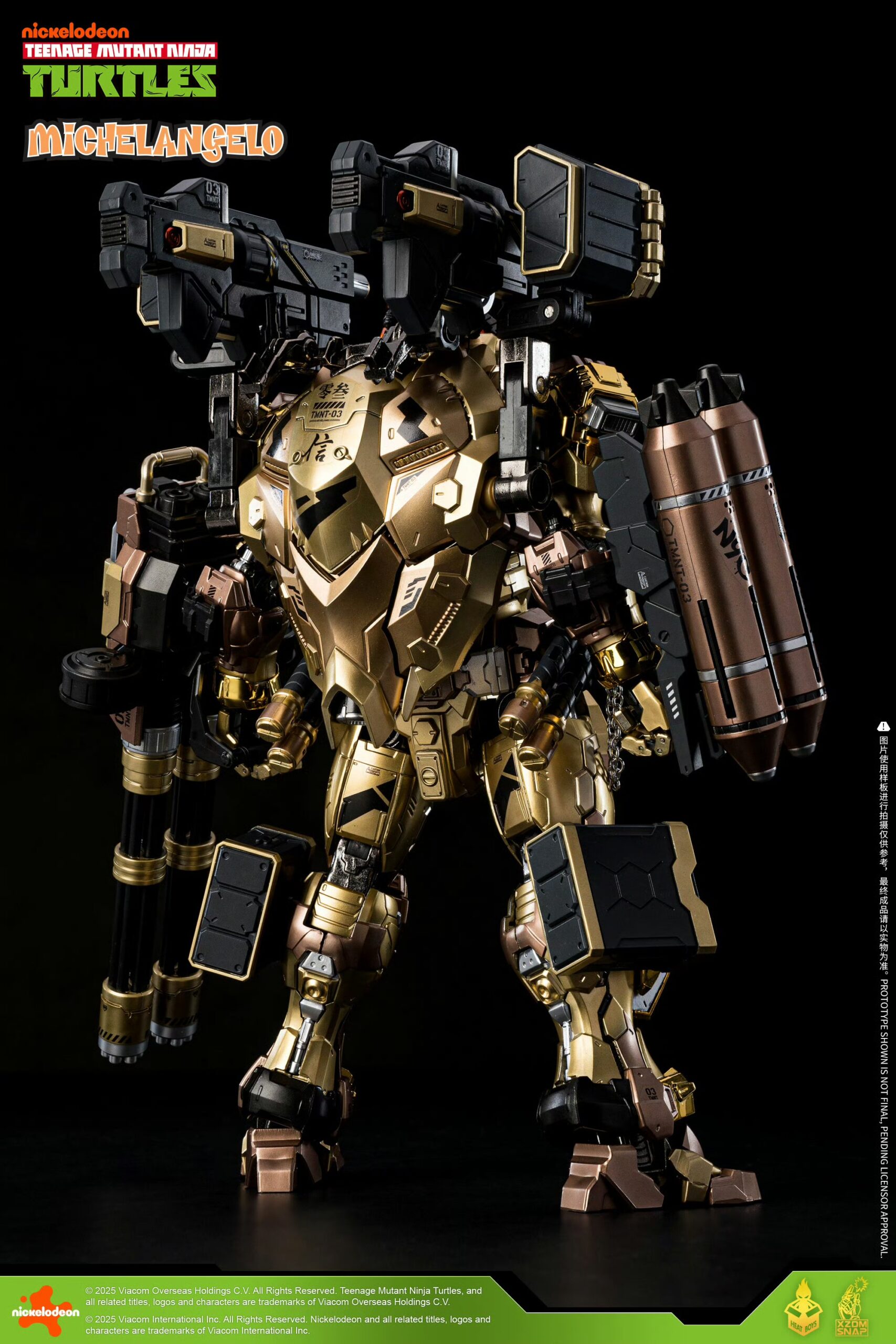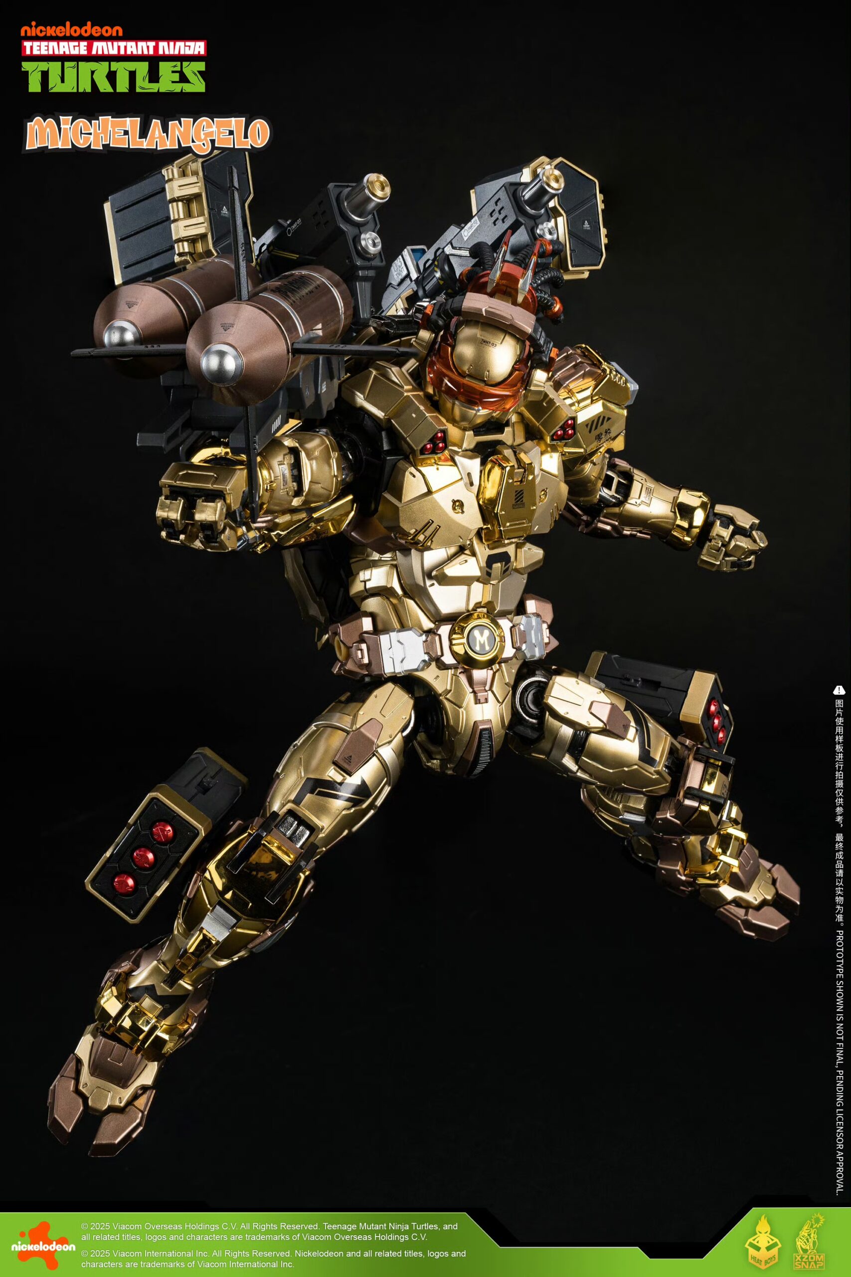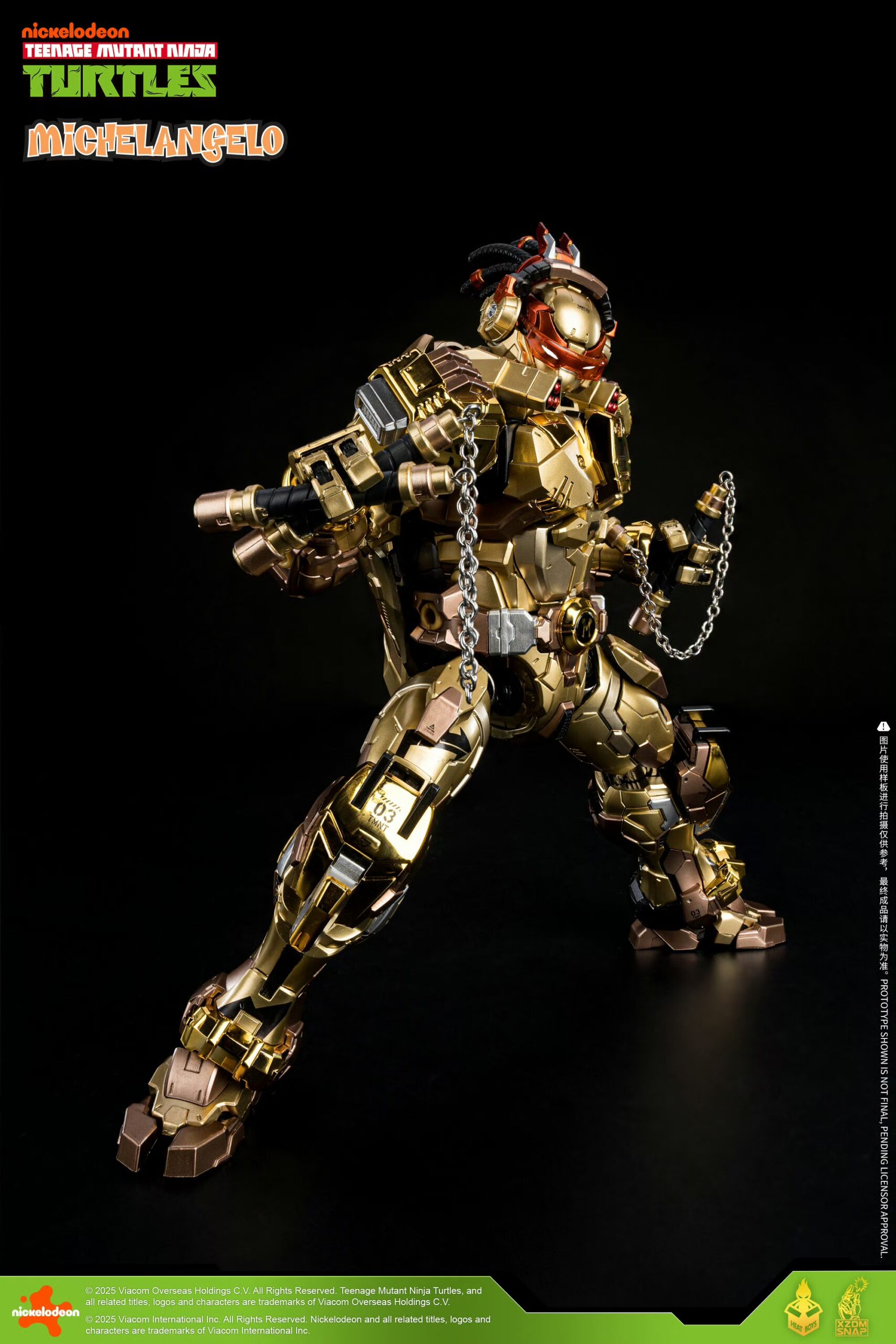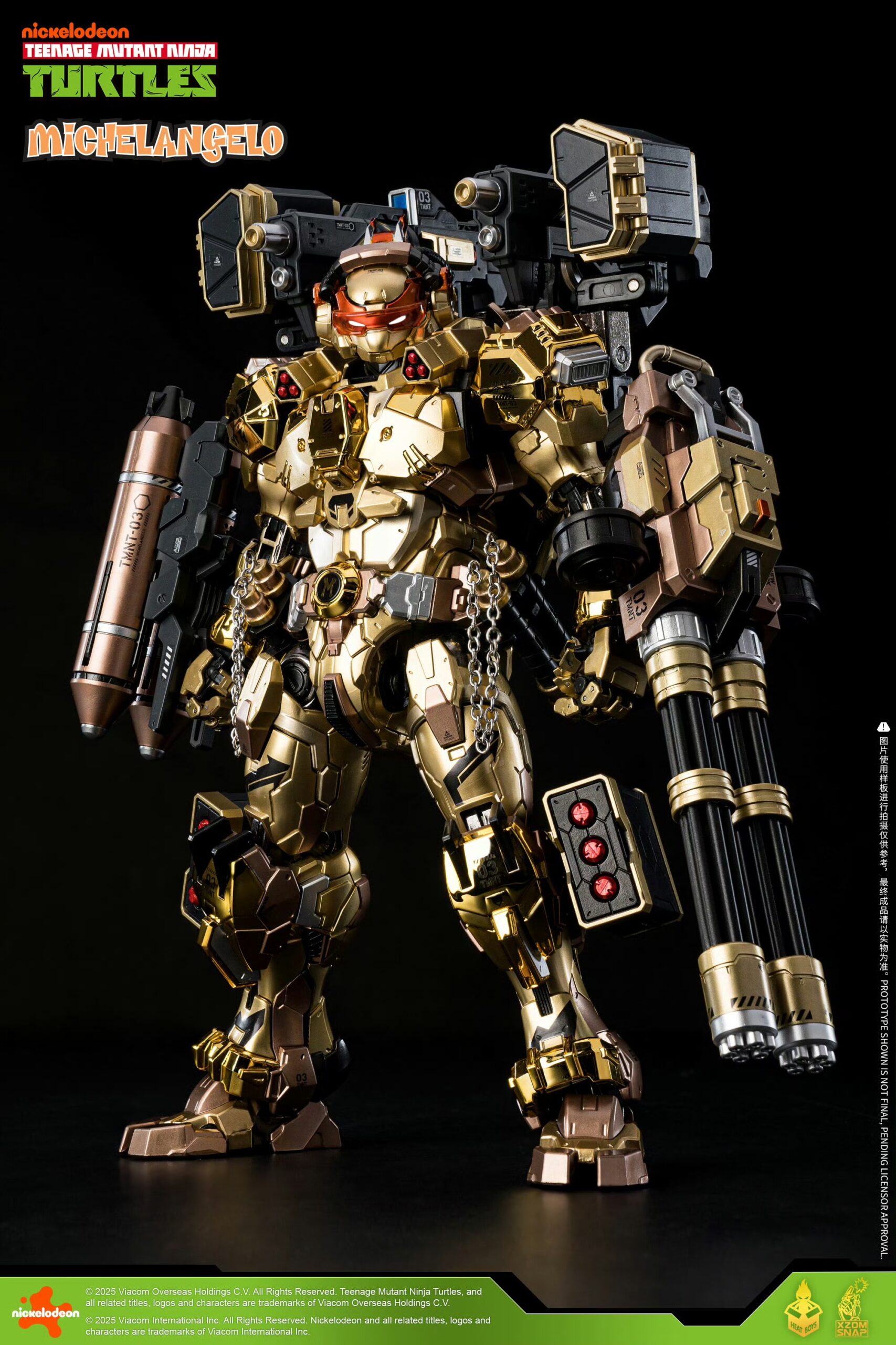 HEATBOYS推出會場限定版《忍者龜》米開朗基羅金耀版,融合高質感金屬塗裝與可動合金骨架,完美展現重裝機甲風格。