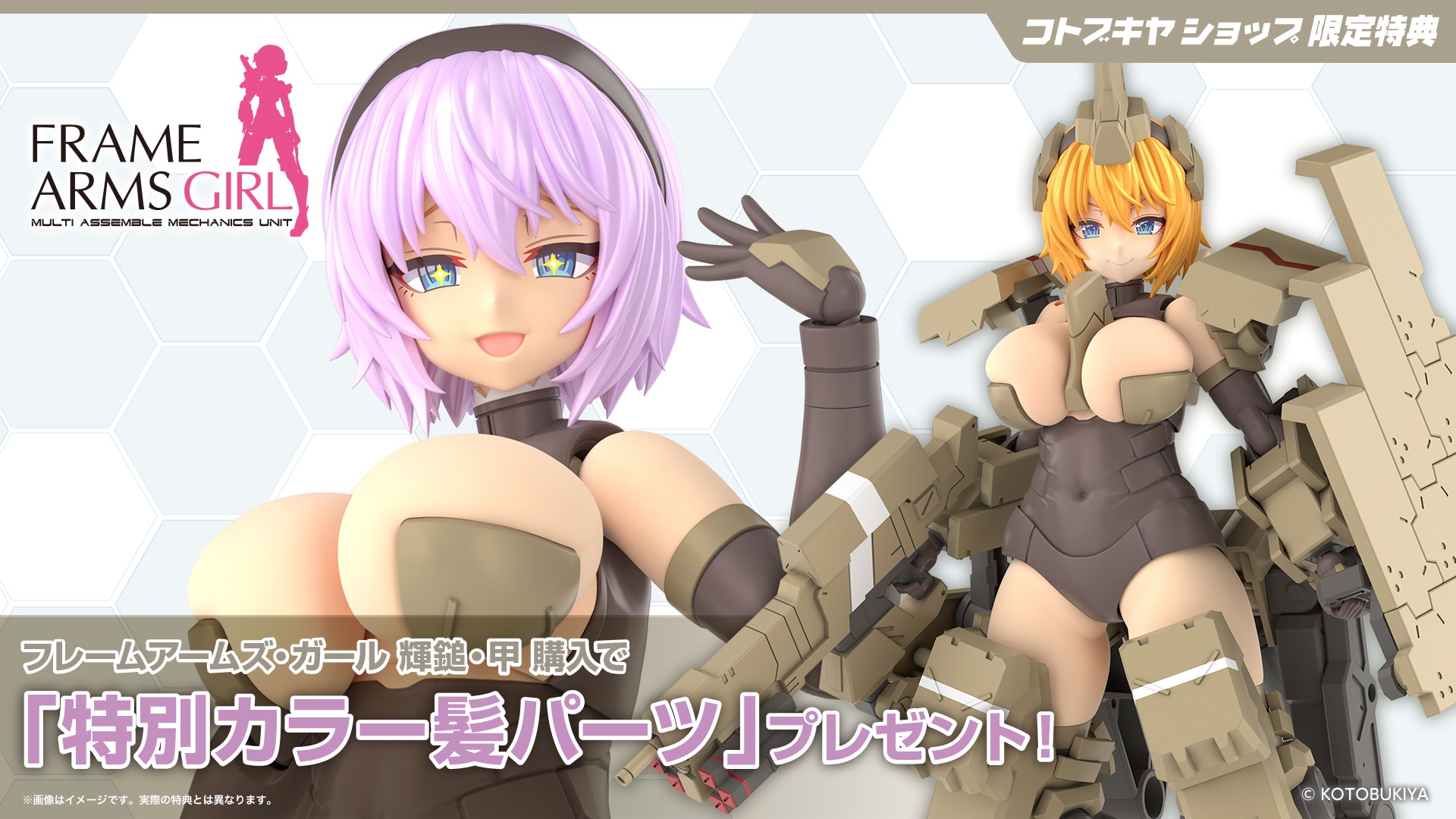 將機械設計師稻田航原創的Frame Arms骨裝機兵「輝鎚.甲」厚重裝甲感,經由どぅーゆー老師之手完美轉化為充滿肉感魅力的美少女形象。這款全新設計的FA Girl,擁有系列中數一數二的壯碩與肉感線條,完美平衡了「力量」與「萌點」!