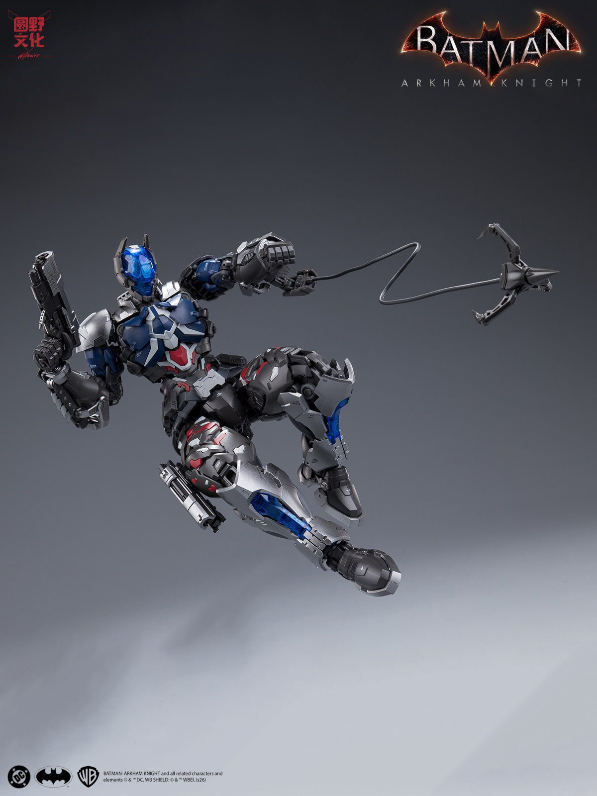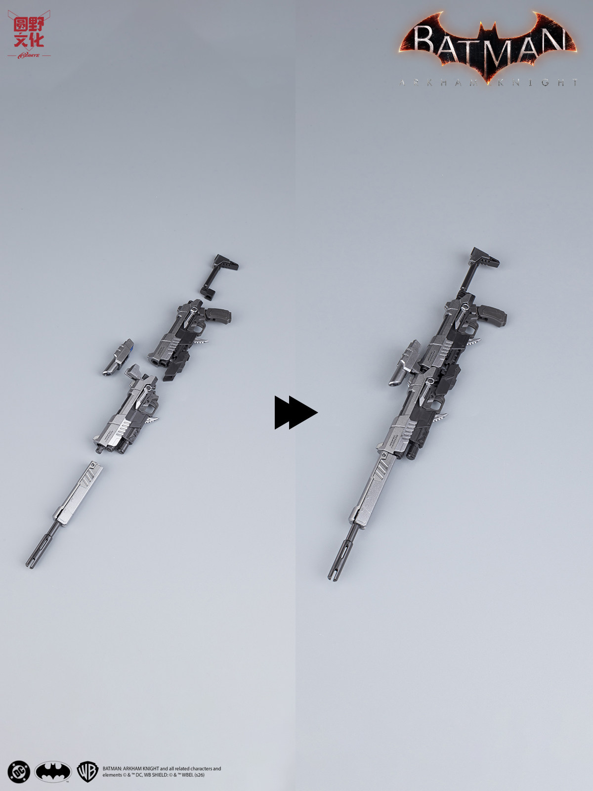 -附帶蝙蝠鏢、鉤爪槍等多種經典戰術裝備。其中阿卡姆騎士標誌性的兩把改裝手槍,兩把手槍除了有各自獨立的變形方,還可以合體為完全體的狙擊模式,這種合體方式是首次出現在同角色產品中。