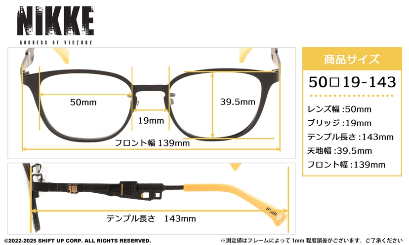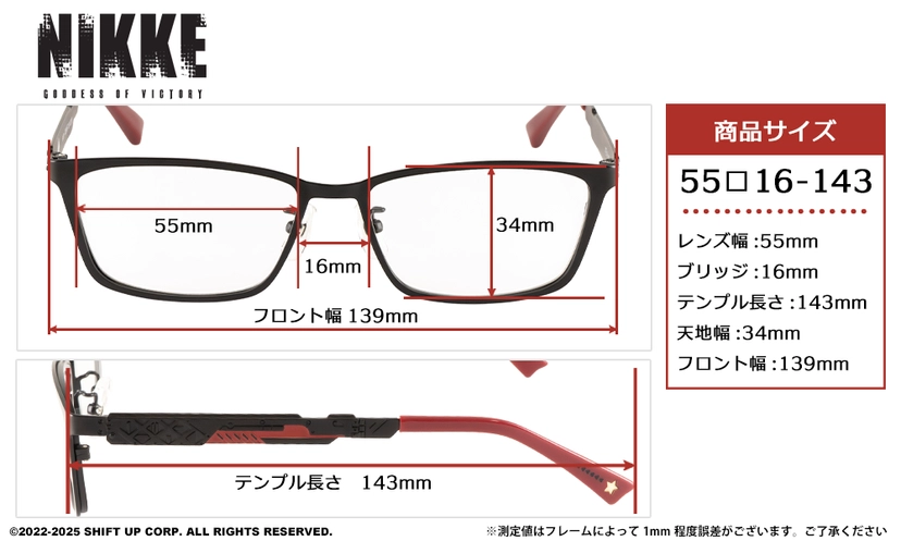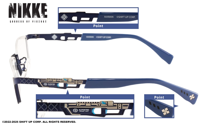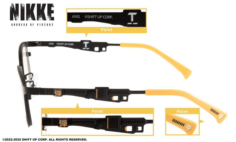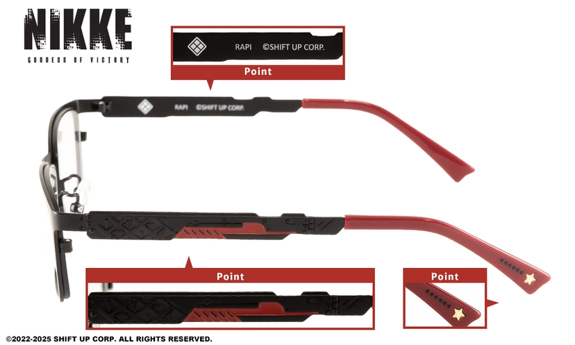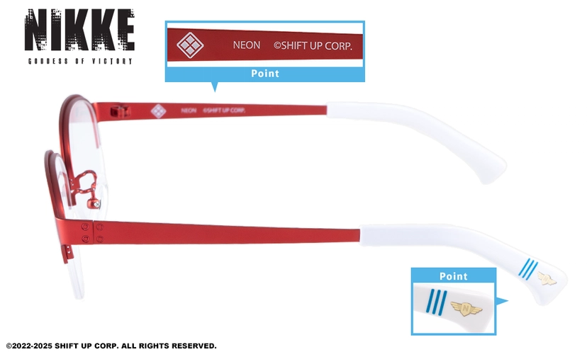 設計細節:在鏡腳內側或末端,皆可看到妮姬的代表性符號、服裝紋理或妮姬LOGO,設計低調卻充滿巧思。