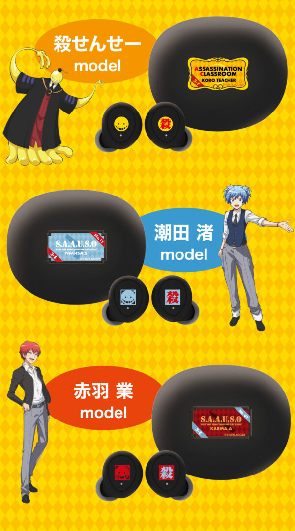 【三款經典型號選擇】:殺老師Model:外殼印有招牌的黃色笑臉圖案,充電盒則是3-E班專屬標誌。潮田渚Model:簡潔的設計搭配渚的象徵色圖騰。赤羽業Model:帥氣且俐落的設計感,展現業的個人風格。