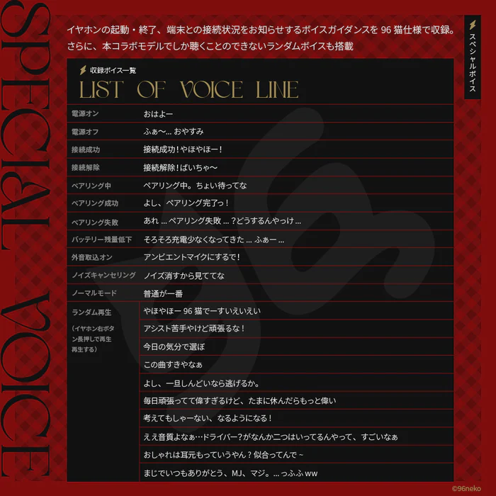 -收錄了啟動、關機及連接狀態的專屬語音。更搭載了「隨機播放語音」功能,只有擁有此款耳機的粉絲才能聽見的驚喜小彩蛋!