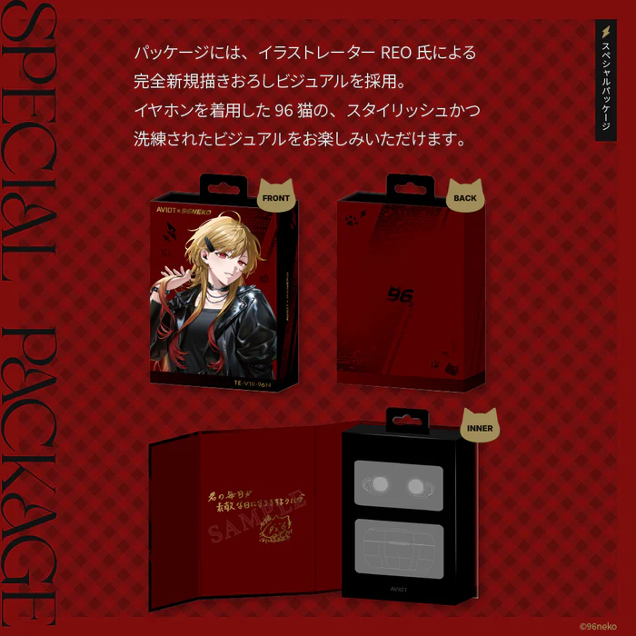 -外盒包裝採用知名插畫家REO氏專為本次合作開發的全新視覺圖。畫中96貓佩戴耳機的俐落身影,極具收藏價值。