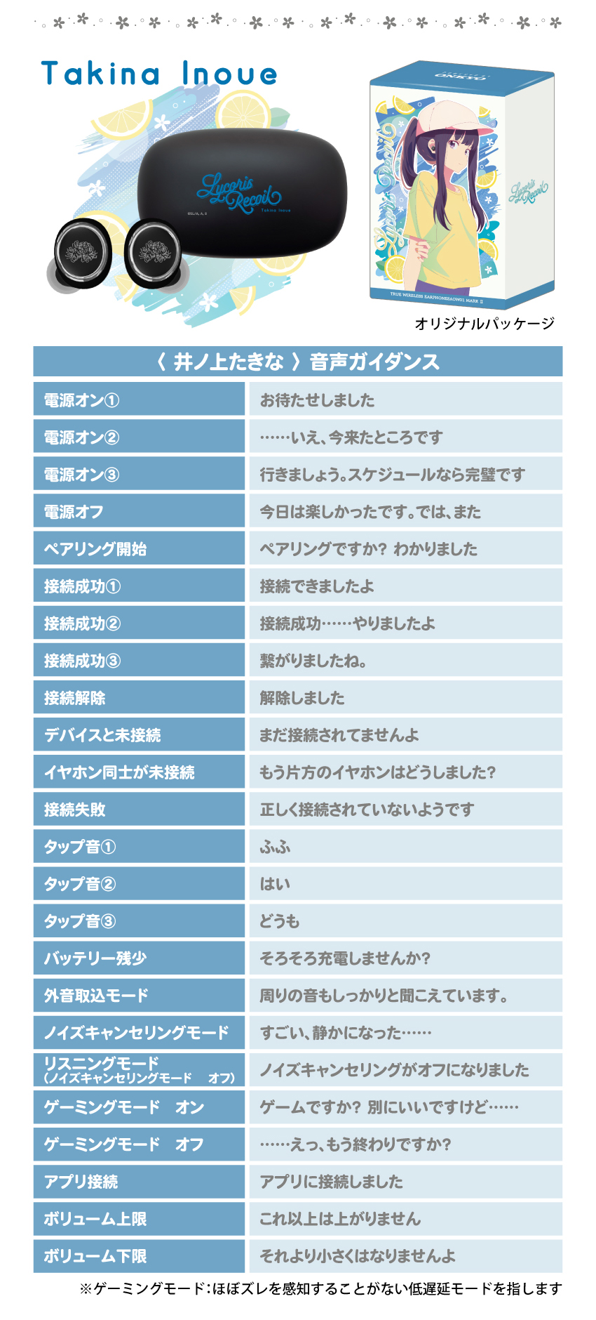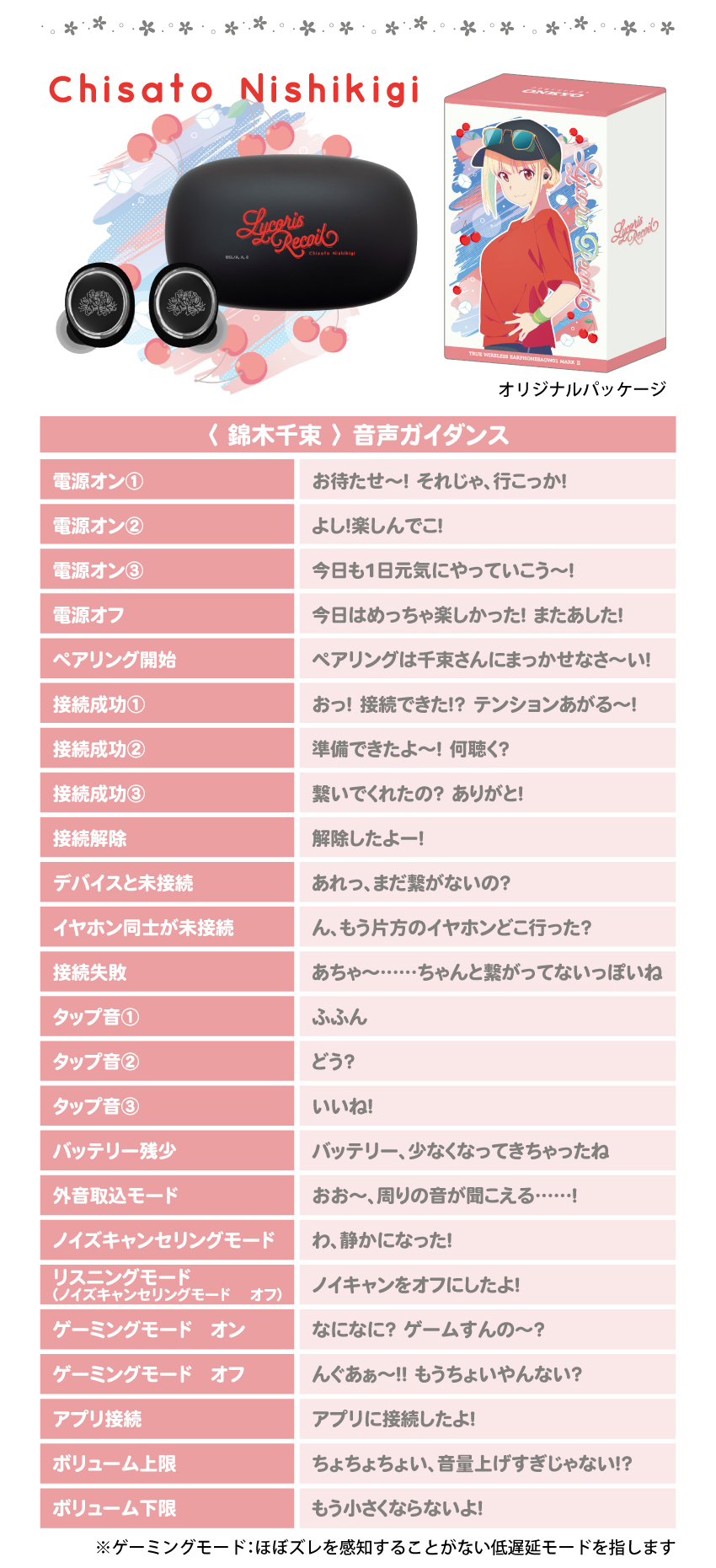 -耳機內建由錦木千束(CV:安済知佳)和井之上瀧奈(CV:若山詩音)全新錄製的操作語音!開機、關機、連線、電量等操作,都由Lycoris們親自為您導航。