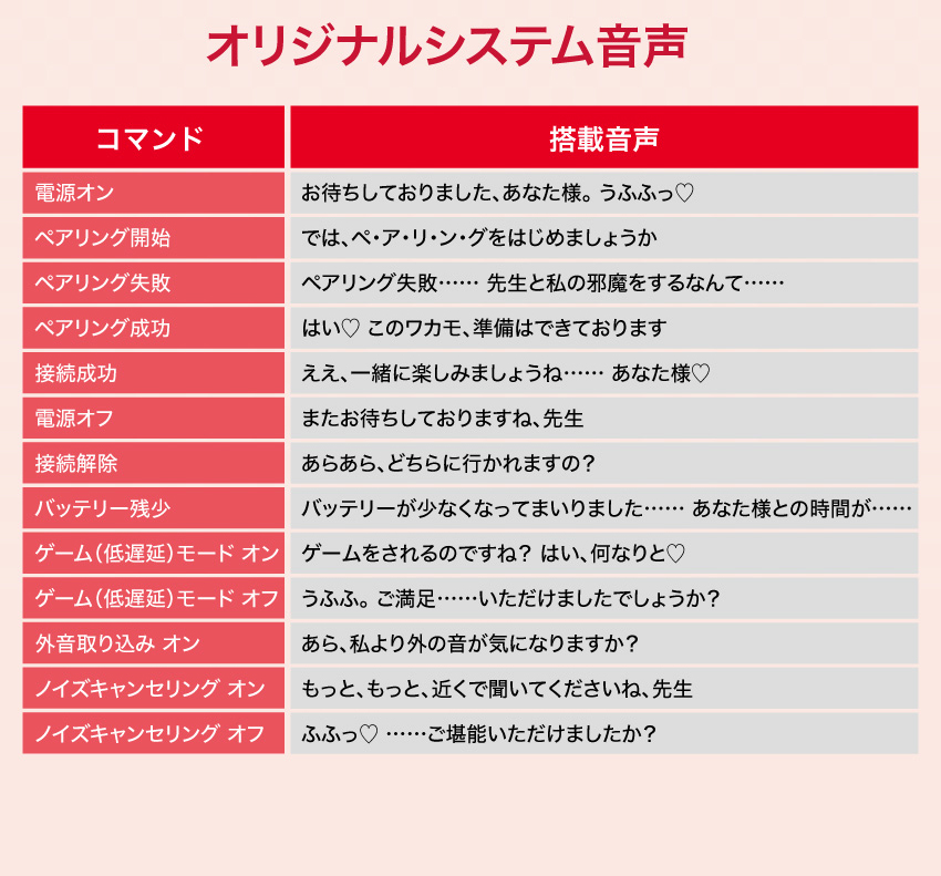 -若藻 (CV: 齋藤千和) 全新錄製專屬語音。耳機內建由人氣聲優齋藤千和老師親自配音的提示語音,從耳機配對、開關機到低電量提醒,若藻都會以那充滿病嬌美感且飽含愛意的語音為您服務。每一下操作,都是與若藻的親密接觸。