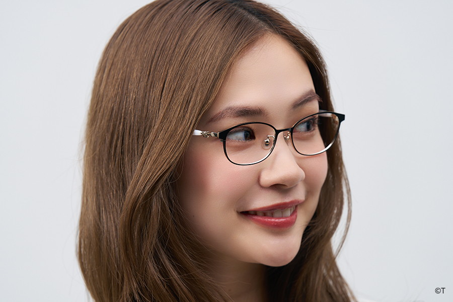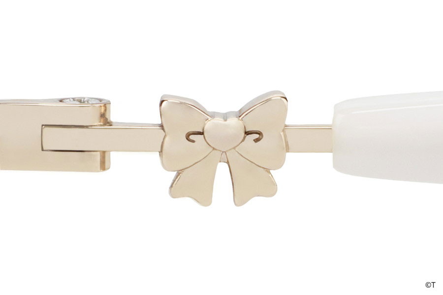設計亮點:金屬細框呈現知性且優雅的形象,鏡腳的白色質感與緞帶點綴出上品名媛感。