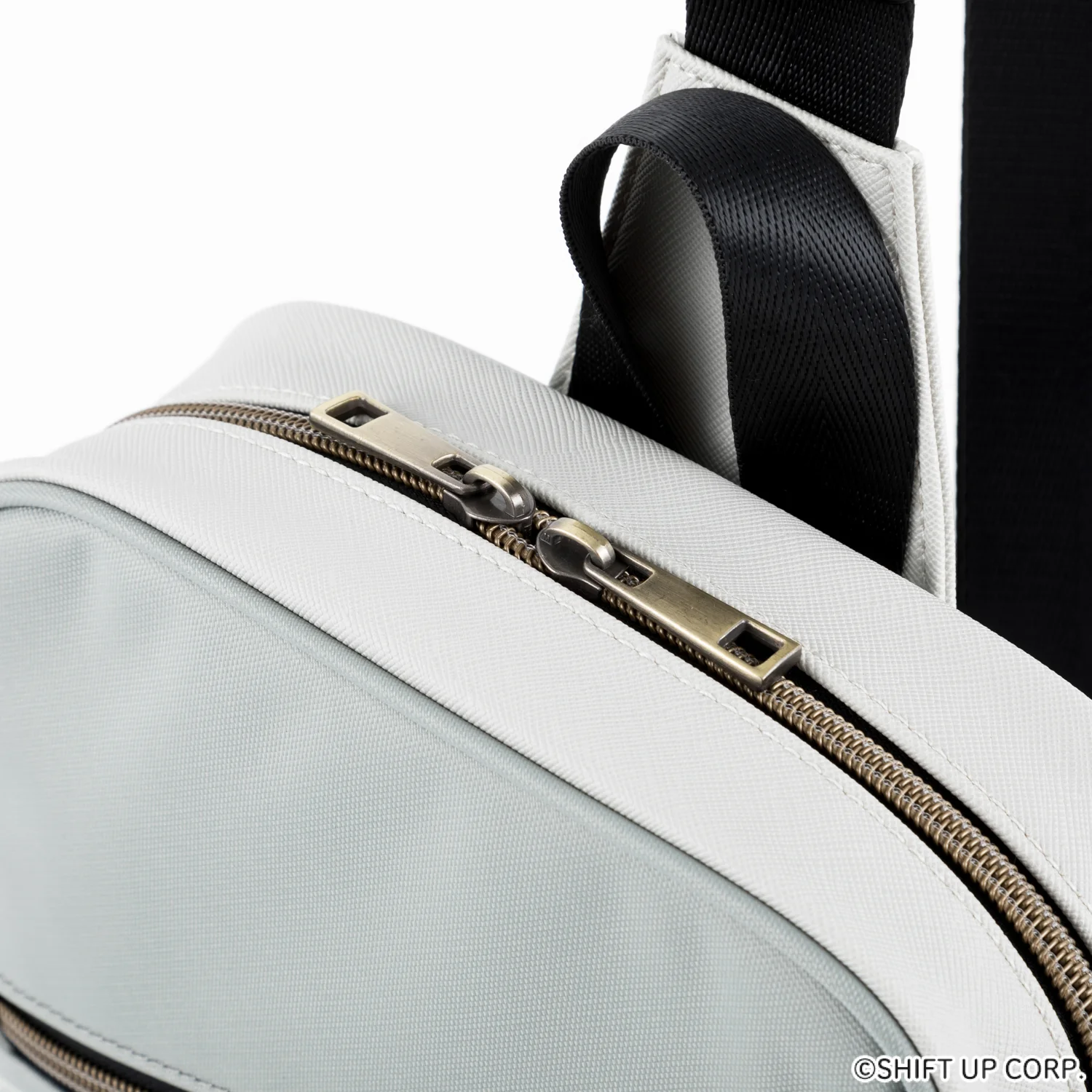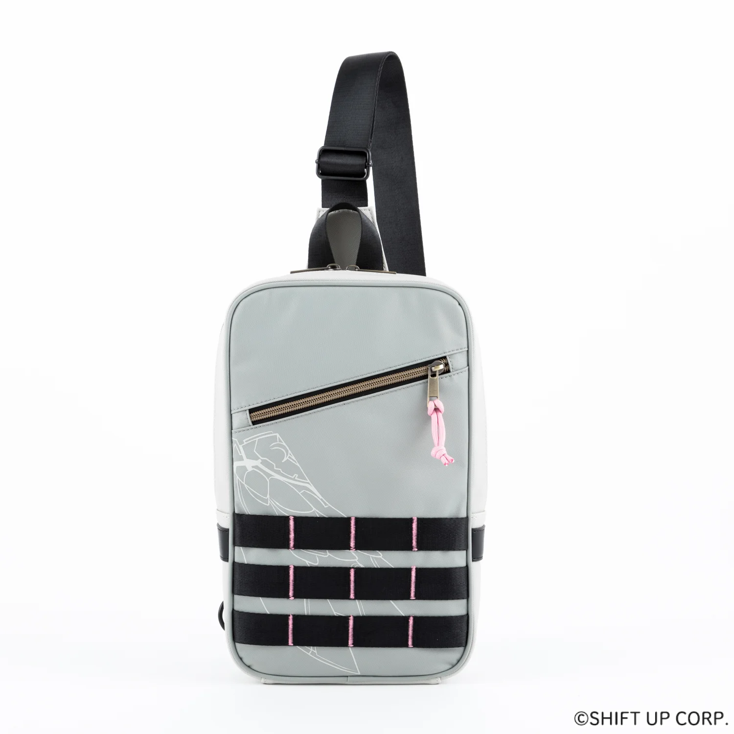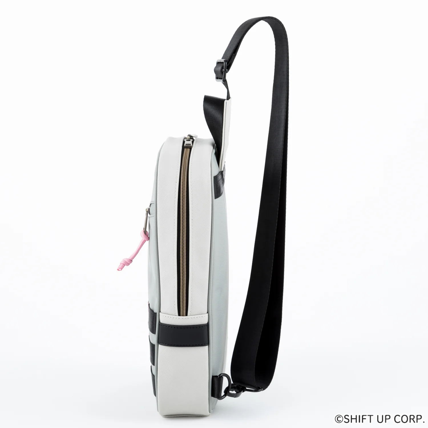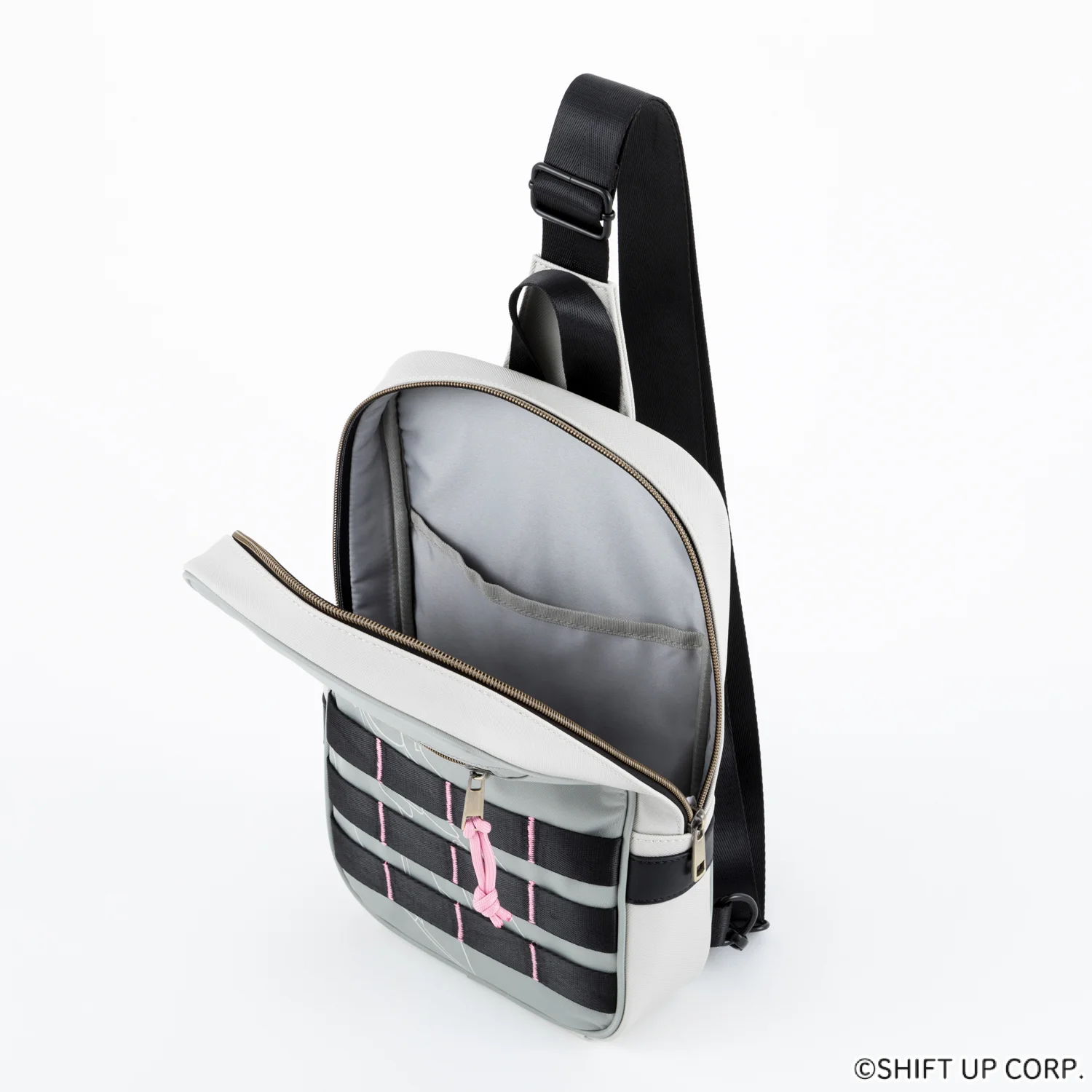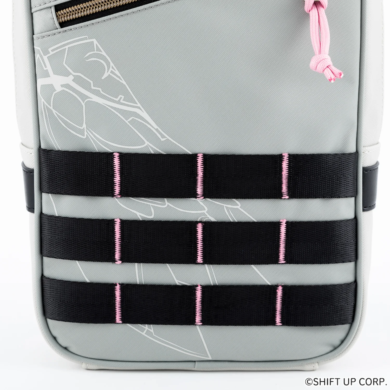 斜角金色拉鍊線搭配淡粉色拉鍊頭,展現細膩層次感。底部設計融入黑色飾帶與粉色縫線,呼應角色服裝細節,內裡則為時尚的淺灰色調,簡約不失質感。